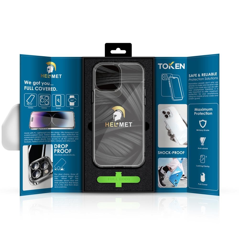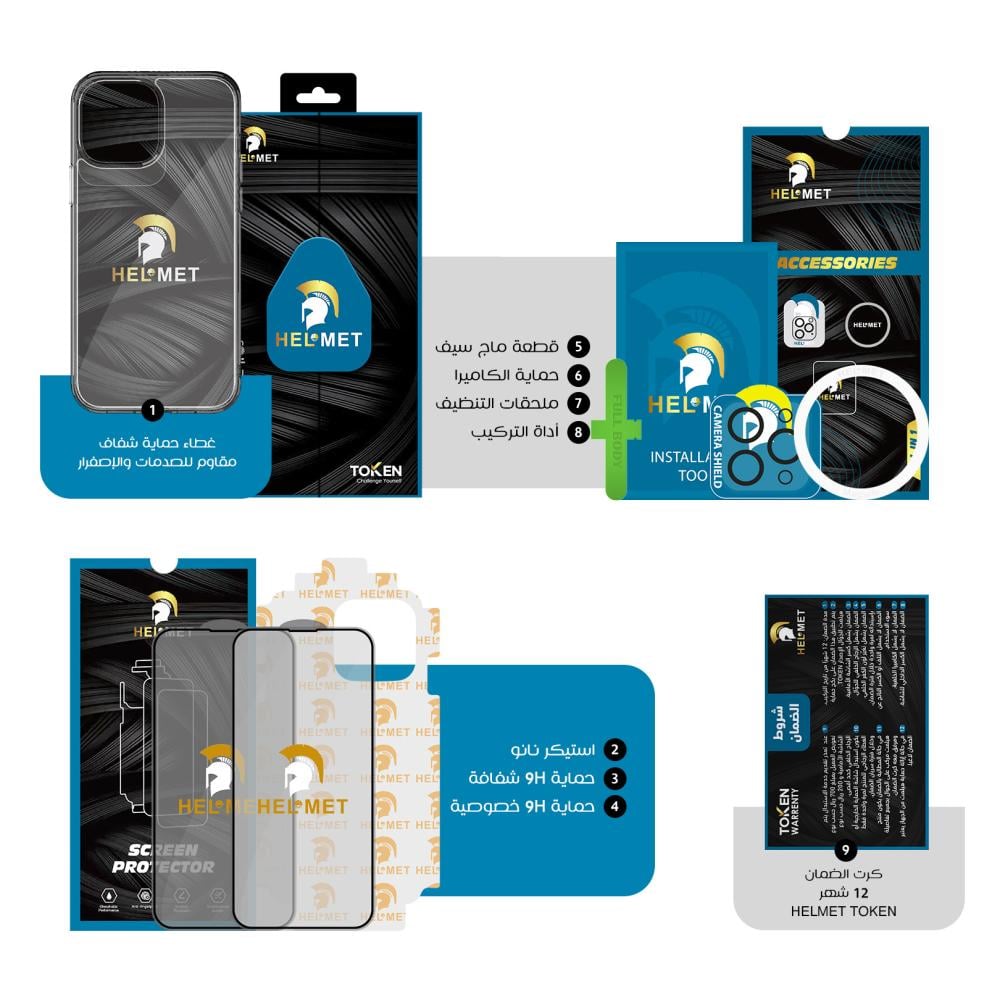 بكج الحماية المتكاملة للايفون ماركة هيلمت HELMET Token, حماية فائقة لجوال ايفون 14 برو ماكس ضمان ضد الكسر لمدة 12 شهر أحمي جوالك من جميع المؤثرات الخارجية من اتربة واوساخ وصدمات وخدوش مع بكج الحماية الاقتصادي من هيلمت.